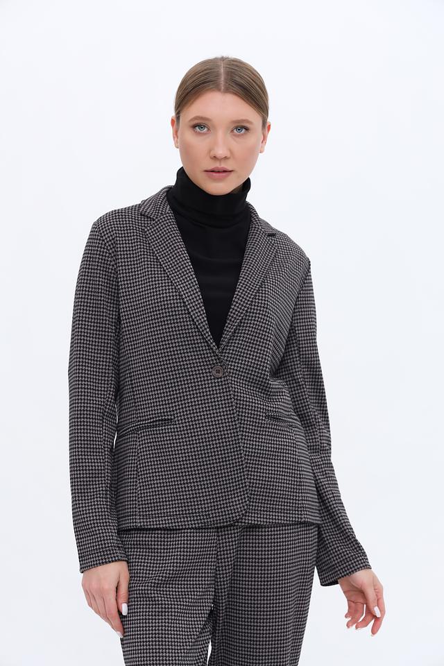Модель застегивается на одну пуговицу, что придает ей элегантный вид. Длинные рукава и лацканы добавляют жакету классический силуэт. Жакет выполнен из полиэстера, вискозы и эластана, что обеспечивает ему приятные тактильные ощущения и хорошую износостойкость.