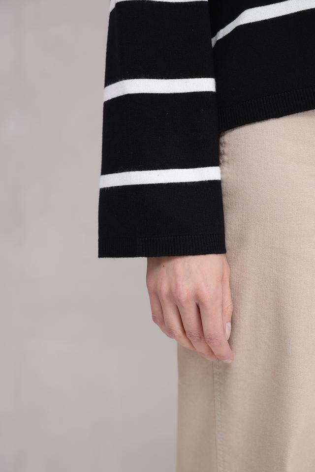 Основной цвет жакета – чёрный, украшен широкими белыми полосами, создающими яркий и динамичный дизайн. Материал – сочетание 70% вискозы и 30% нейлона, что обеспечивает приятные тактильные ощущения и хорошую посадку по фигуре.