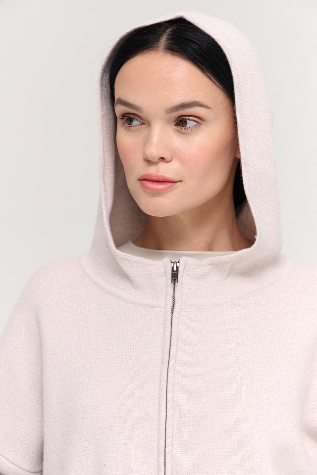 Жакет имеет удобный капюшон и застегивается на молнию. Прямой крой обеспечивает свободу движений, а лаконичный дизайн делает его подходящим для создания как повседневных, так и более элегантных образов.