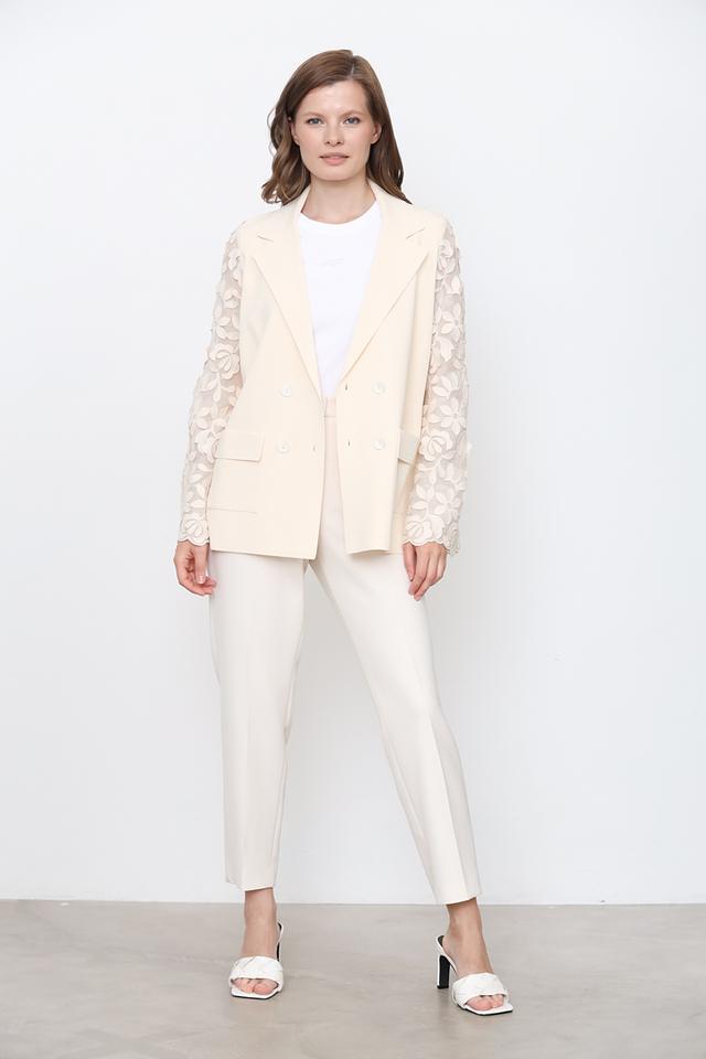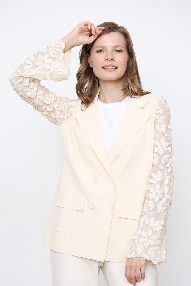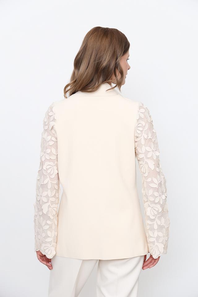 Особенностью модели являются рукава, выполненные из изящного кружева с цветочным узором. Кружево придает жакету женственность и элегантность. Жакет хорошо сочетается с брюками, юбками и платьями, позволяя создавать разнообразные образы.