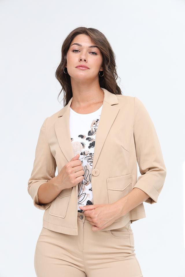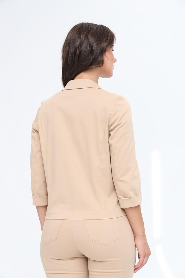 Жакет выполнен из высококачественного хлопка с добавлением эластана, что обеспечивает комфорт в носке и хорошую посадку по фигуре. Укороченный силуэт и рукава ¾ делают его идеальным для создания модных и стильных образов.