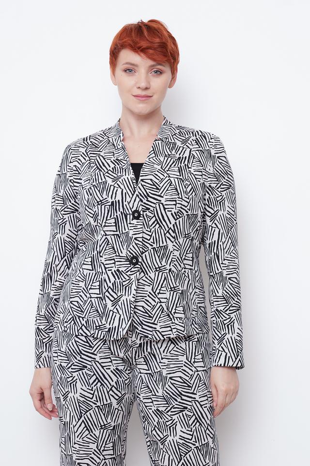 Жакет Frank Walder чёрно-белого цвета с оригинальным геометрическим принтом. Модель выполнена из вискозы с добавлением полиэстера и эластана, что обеспечивает комфорт и хорошую посадку по фигуре. Состав: вискоза 58%, полиэстер 38%, эластан 4%