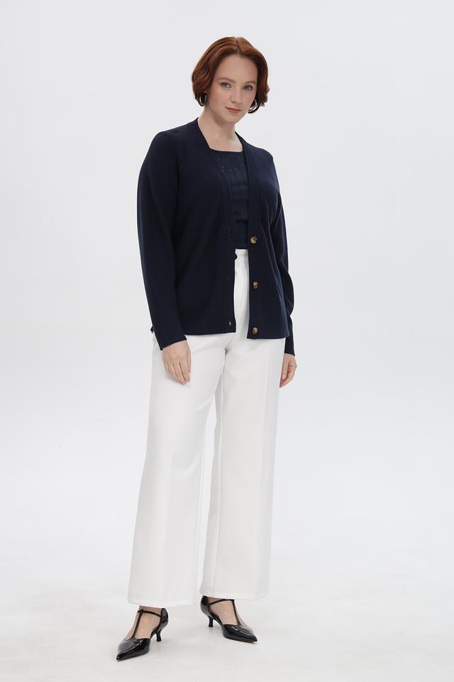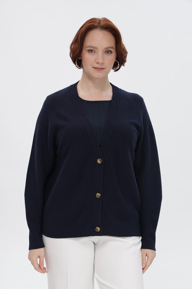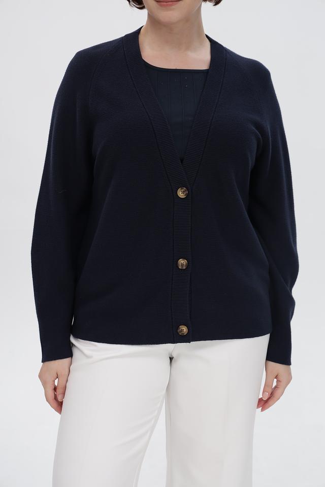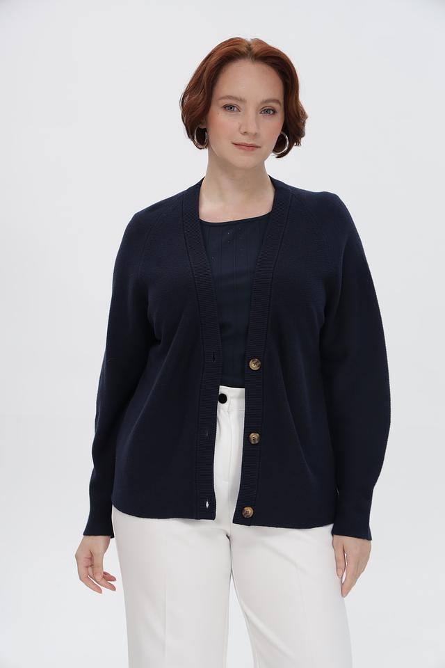 Жакет имеет V-образный вырез и застегивается на пуговицы. Длинные рукава и удобный крой делают его идеальным выбором для прохладной погоды.