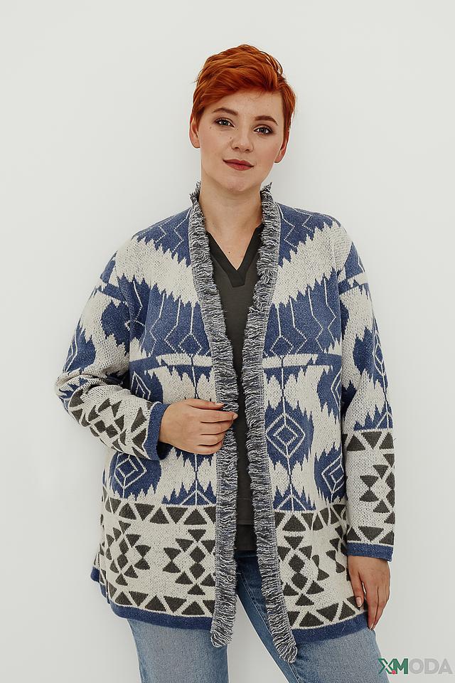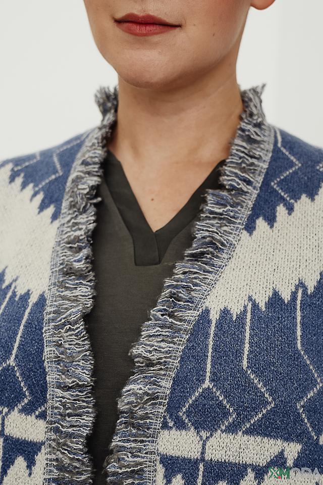 Вязаный жакет Frapp синего цвета с геометрическим узором станет отличным дополнением к вашему гардеробу. Модель с открытым кроем и бахромой по краям придает образу непринужденность и стиль. Состав: полиакрил 44%, полиамид 32%, полиэстер 14%, шерсть 6%, эластан 2%, мохер 2%