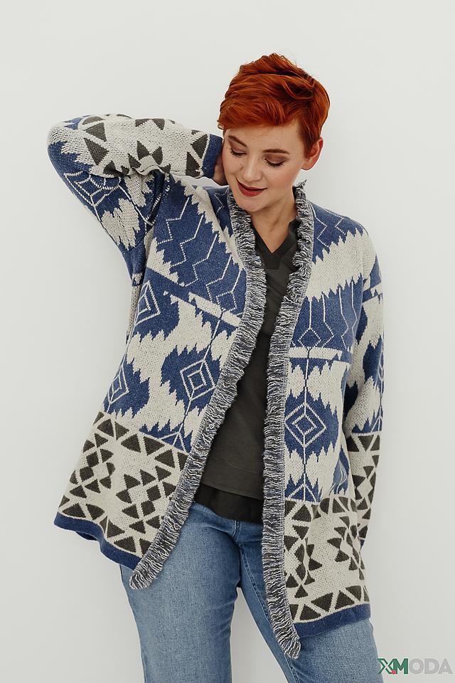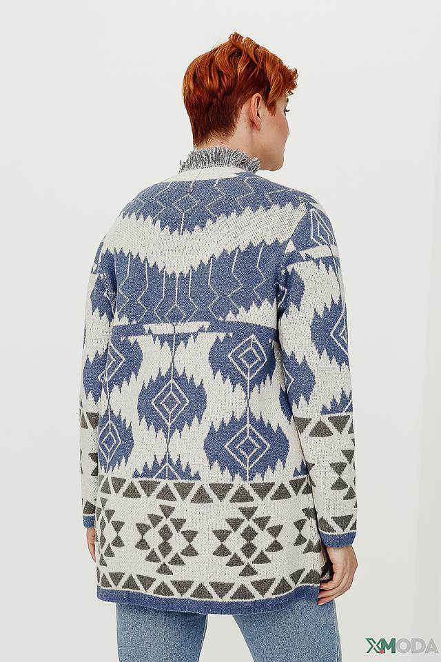 Этот жакет от Frapp – идеальный выбор для создания уютного и стильного образа. Жакет выполнен в технике вязания с выразительным геометрическим узором, сочетающим в себе оттенки синего, белого и серого.