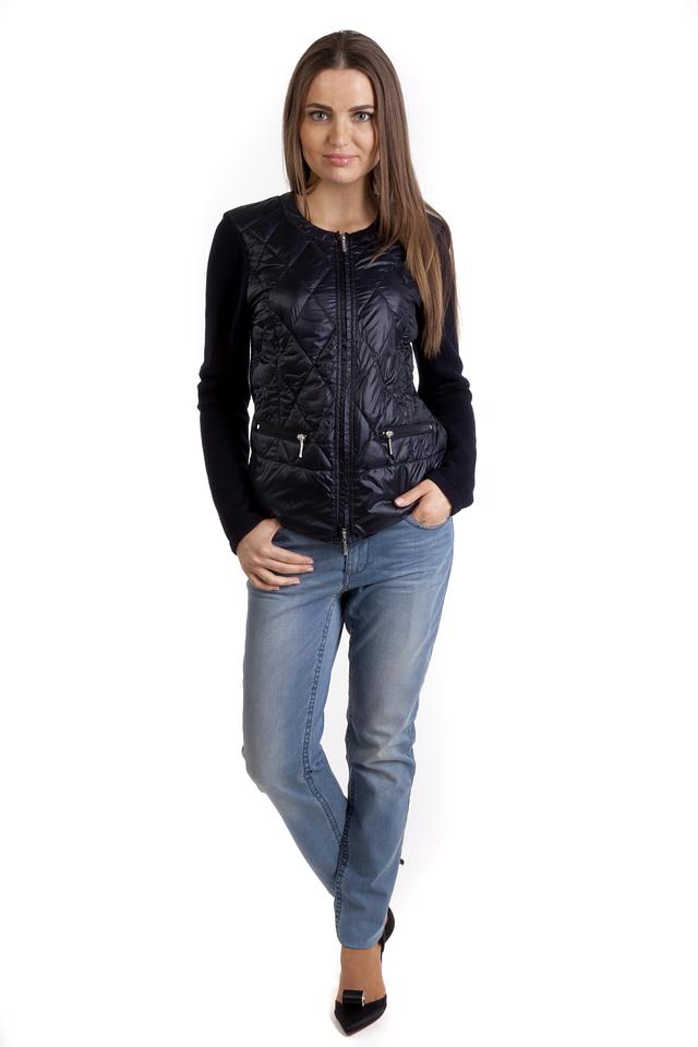Стильный жакет Gerry Weber синего цвета с комбинированным дизайном. Модель выполнена из стеганой ткани и трикотажа, застегивается на молнию и имеет боковые карманы. Состав: хлопок 100%