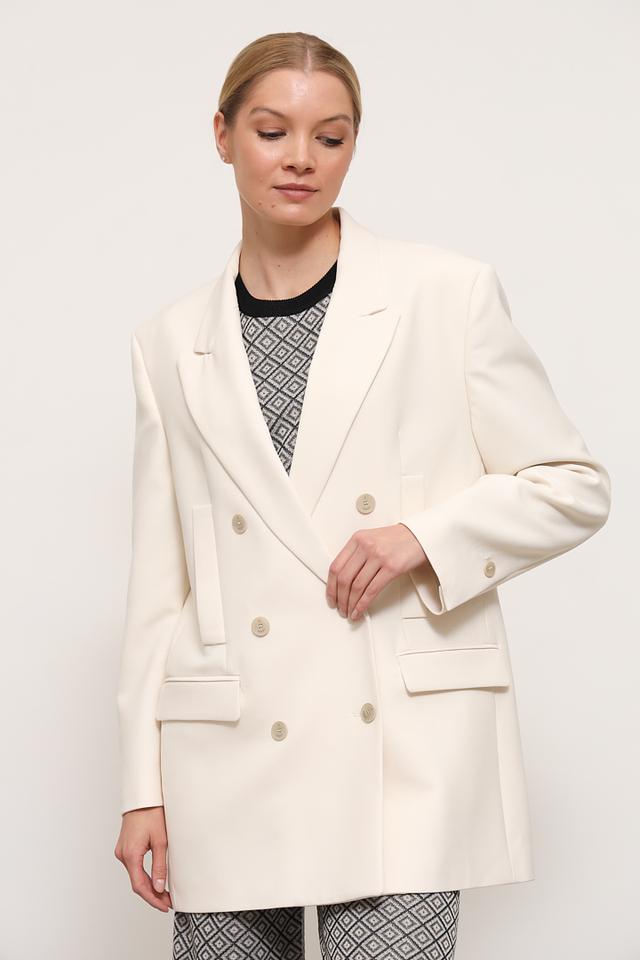 Жакет имеет прямой крой, который обеспечивает комфортную посадку по фигуре. Двубортная застёжка на пуговицах добавляет образу элегантности и строгости. Лацканы классической формы подчеркивают женственность силуэта.