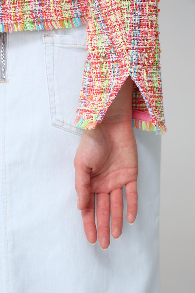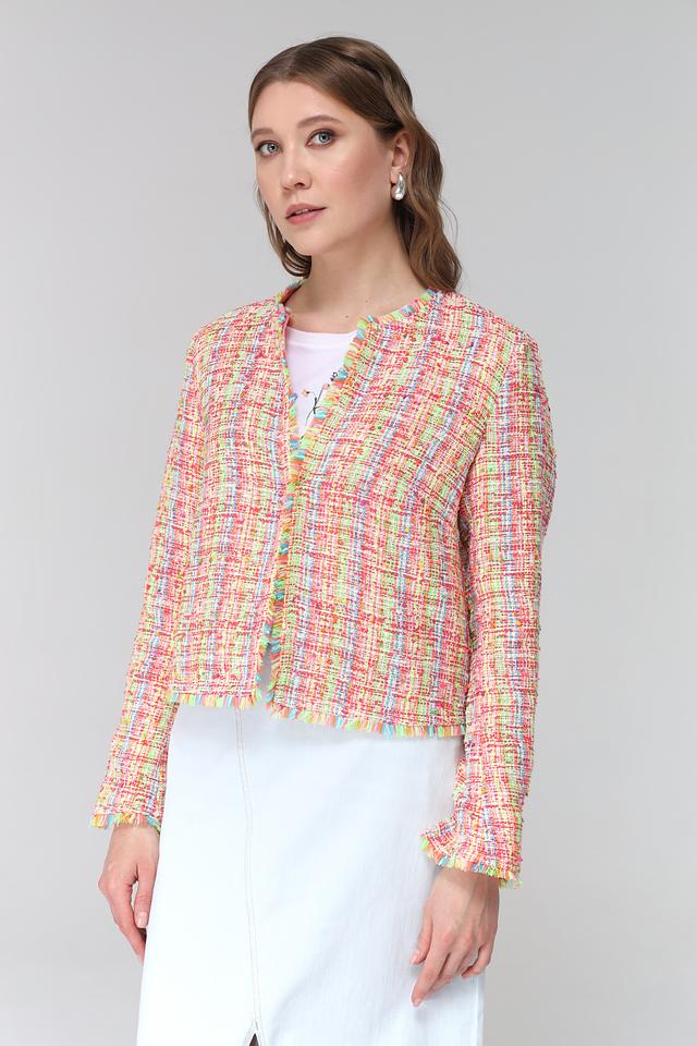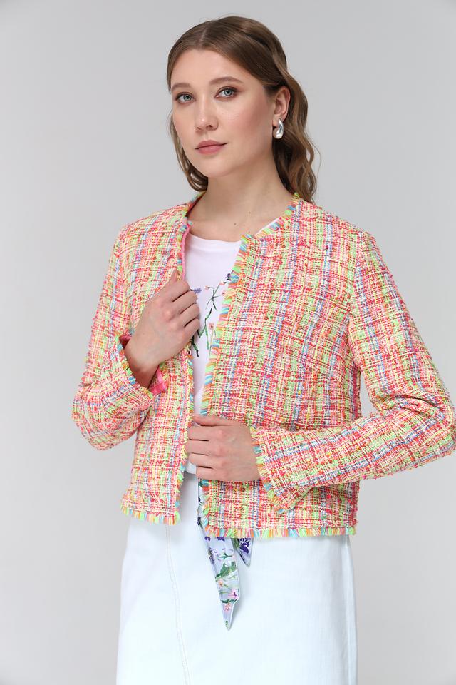 Жакет имеет короткий рукав и классический силуэт. Отделка по краям изделия выполнена в виде бахромы, что придает ему легкость и динамичность.
