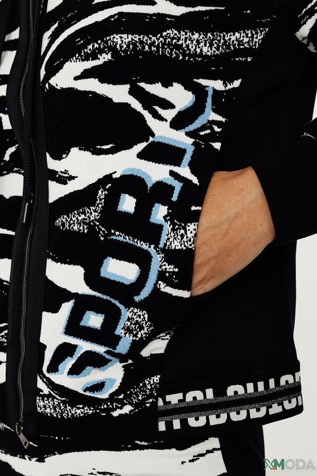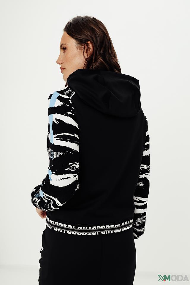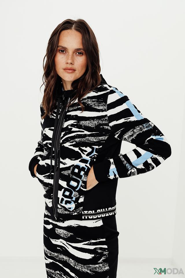 Жакет Marc Cain Sports чёрного цвета с оригинальным принтом – стильное и комфортное решение для создания модных образов. Модель на молнии с капюшоном, выполнена из мягкой вискозы с добавлением эластана. Состав: вискоза 95%, эластан 5%