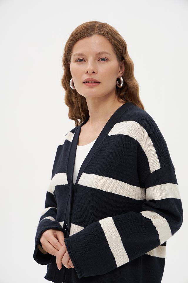Жакет имеет классический крой и V-образный вырез, который визуально удлиняет шею. По всему изделию проходит горизонтальная полоска темно-синего и белого цветов, создающая стильный и современный образ.
