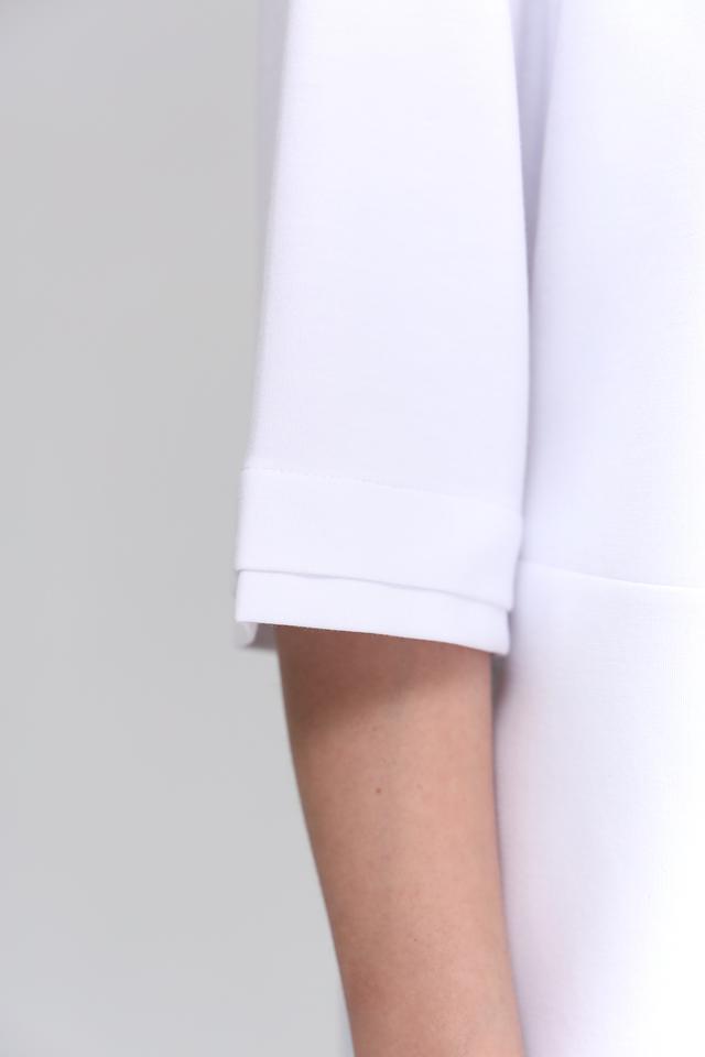 Жакет имеет прямой крой, который подчеркивает фигуру, но не сковывает движения. Короткий рукав 3/4 делает его идеальным для теплой погоды или для ношения в помещении. Отсутствие застежек обеспечивает комфорт и легкость в надевании.