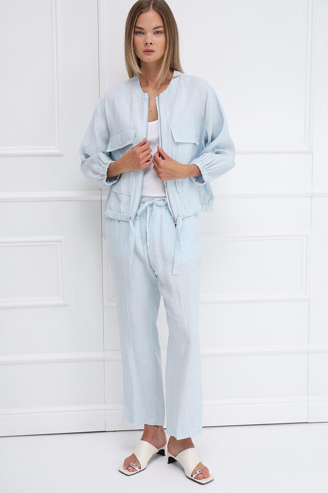 Нежный голубой цвет жакета легко сочетается с различными элементами гардероба, позволяя создавать разнообразные образы – от повседневных до более элегантных. Этот жакет идеально подойдёт для летних прогулок, встреч с друзьями или работы в офисе.