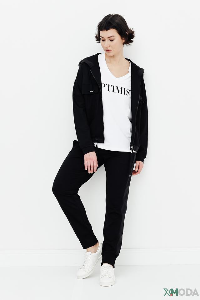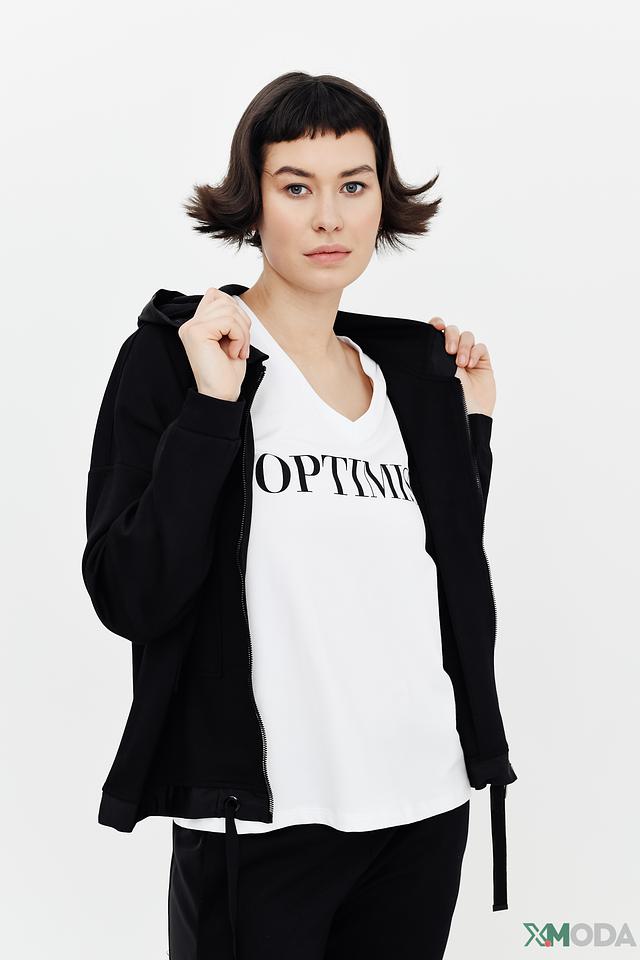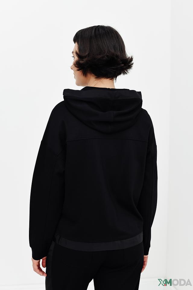 Чёрный жакет Monari с капюшоном и застёжкой-молнией – стильное и удобное решение для создания повседневных образов. Модель выполнена из мягкой ткани с добавлением вискозы, полиэстера и эластана, обеспечивающих комфорт и свободу движений. Состав: вискоза 85%, полиэстер 10%, эластан 5%
