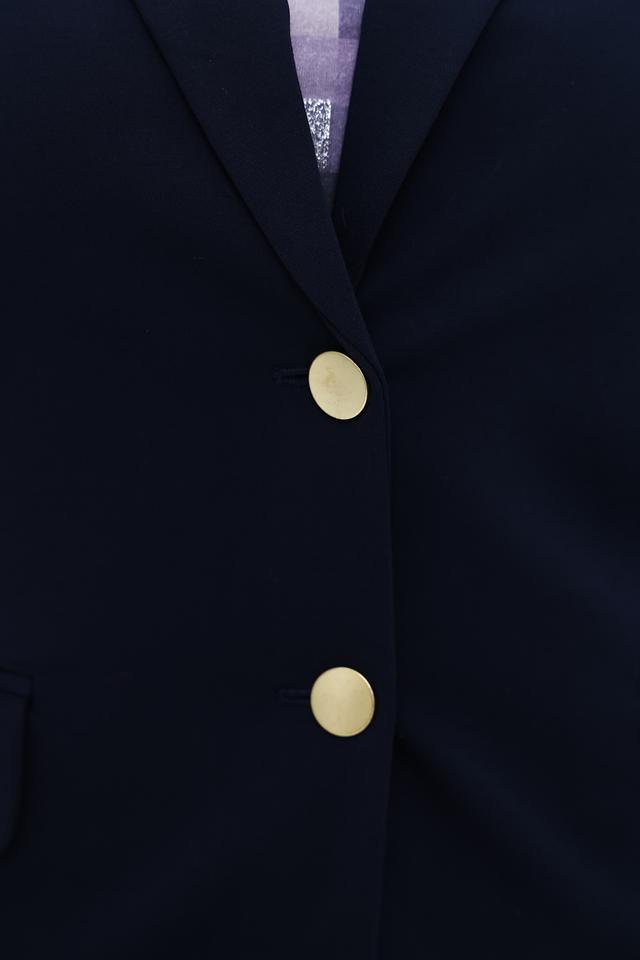 Жакет имеет приталенный силуэт, который подчеркивает фигуру. Застежка на две золотистые пуговицы добавляет элегантности. Накладные карманы обеспечивают функциональность и удобство.