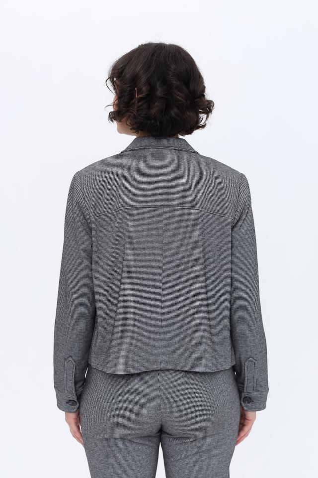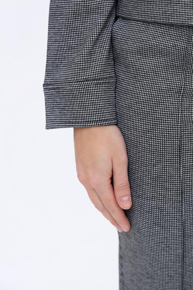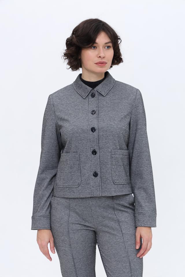 Модель имеет приталенный силуэт, который подчеркивает фигуру, и застегивается на пуговицы. Воротник жакета – отложной. Накладные карманы добавляют практичности и функциональности.
