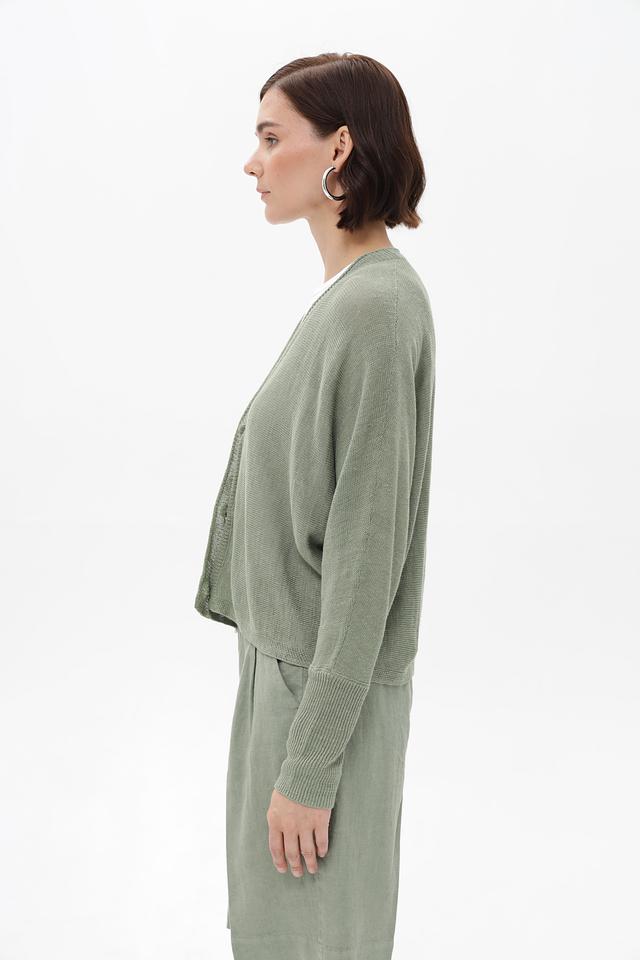 Кардиган выполнен из 100% льна, что обеспечивает комфорт и воздухопроницаемость в теплую погоду. Приталенный силуэт подчеркивает фигуру, а манжеты на рукавах придают изделию аккуратный вид.