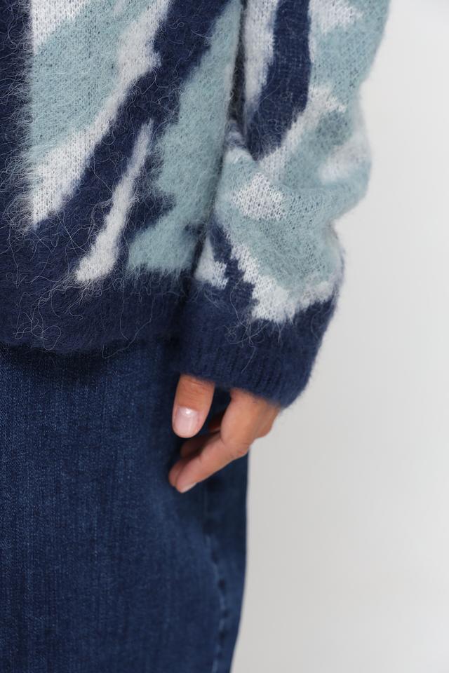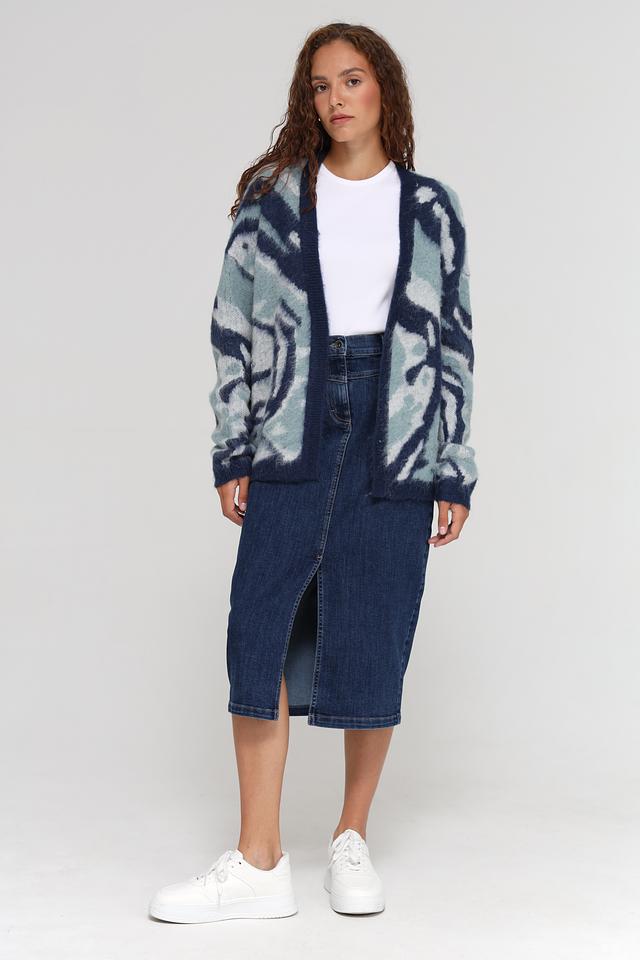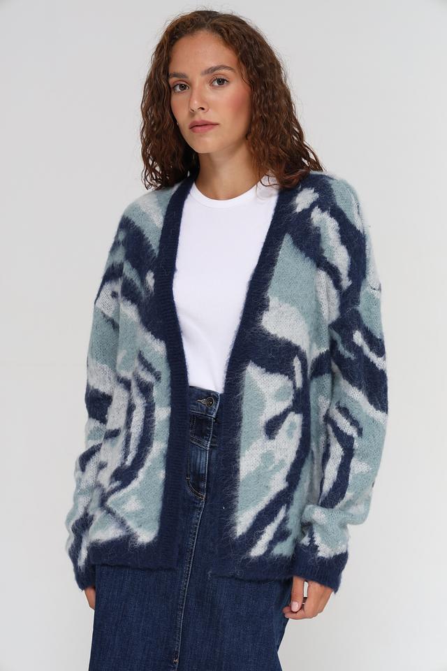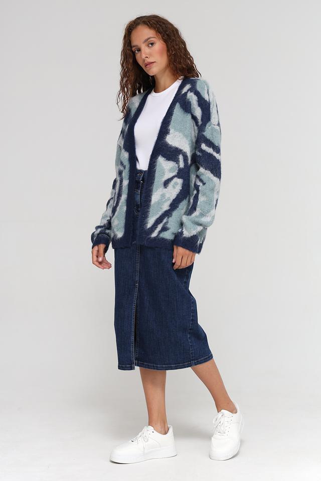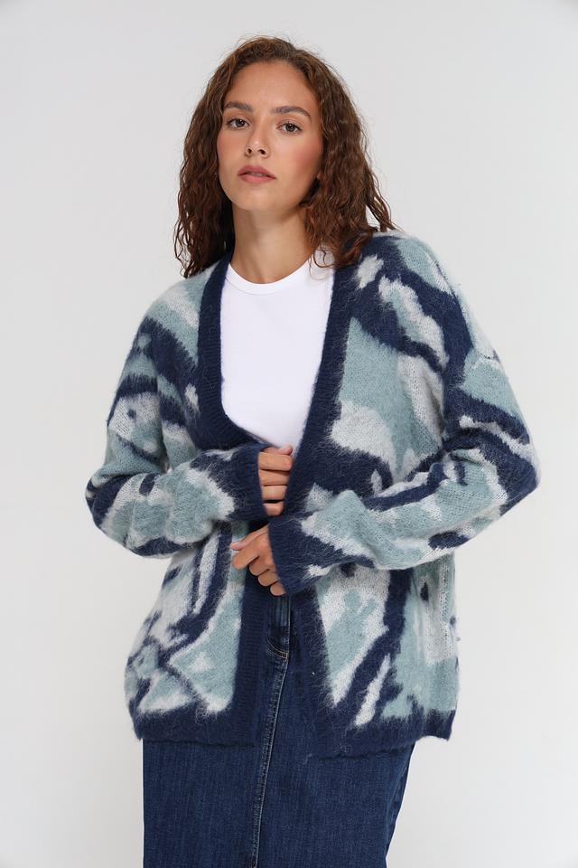 Жакет имеет свободный крой и V-образный вырез. Его отличает яркий и необычный узор, сочетающий в себе оттенки голубого и синего, напоминающий абстрактные волны. Такой принт добавит оригинальности и индивидуальности вашему стилю.