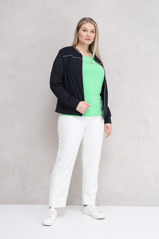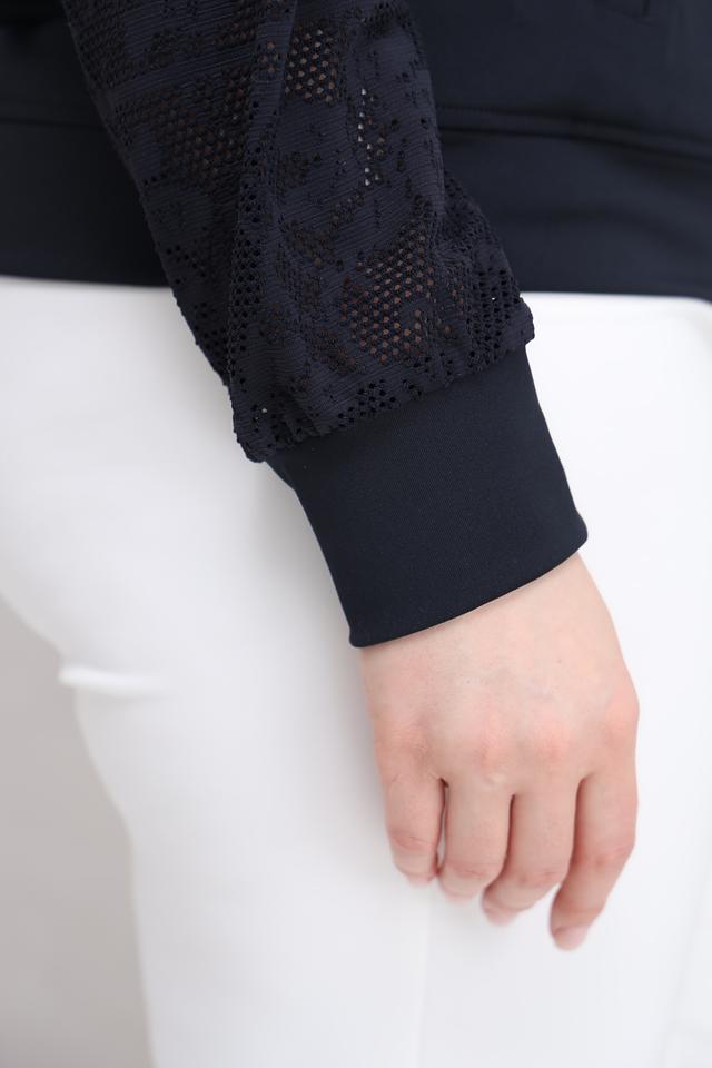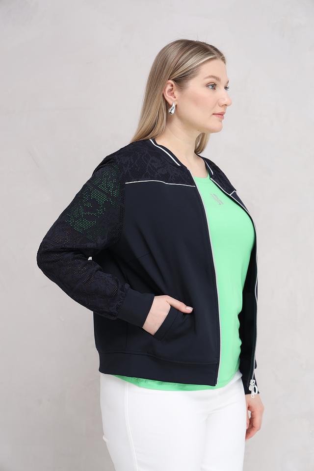 Особенностью модели являются рукава, выполненные из изысканного кружева, что придает жакету элегантность и женственность. Белая отделка по молнии и карманам добавляет контраста и подчеркивает современный дизайн.