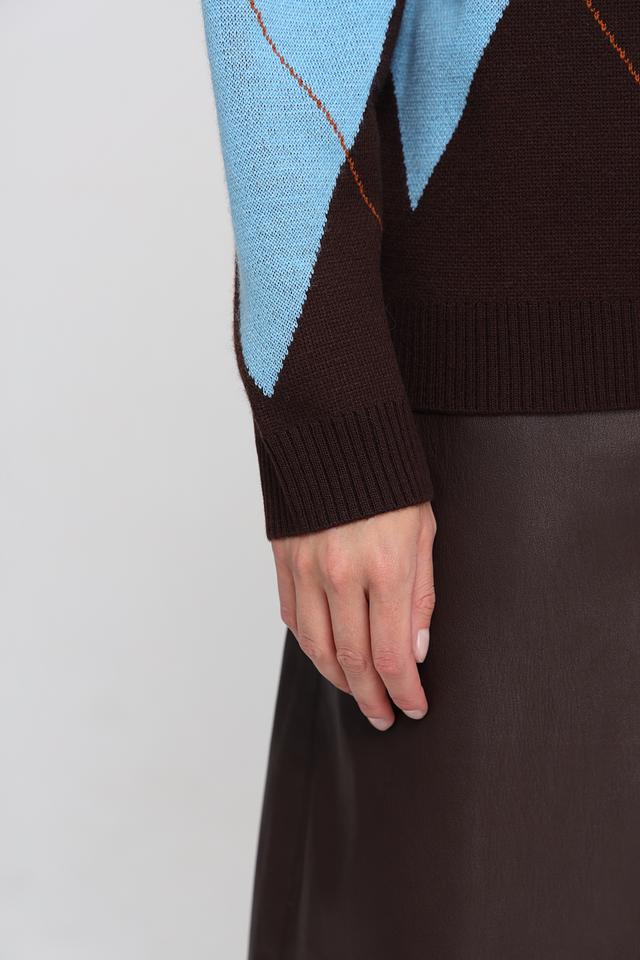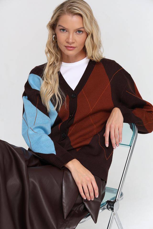 Женский жакет UNQ коричневого цвета с геометрическим узором "ромб" выполнен из мягкой пряжи с добавлением шерсти. Модель застегивается на пуговицы и имеет V-образный вырез. Состав: полиакрил 50%, шерсть овечья 50%