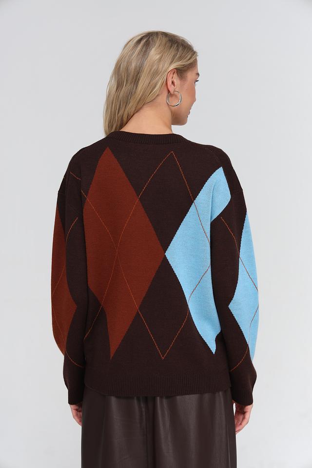 Этот стильный жакет от UNQ станет отличным дополнением к вашему гардеробу. Выполненный в коричневой цветовой гамме с ярким геометрическим узором в виде ромбов, он добавит образу оригинальности и динамики.