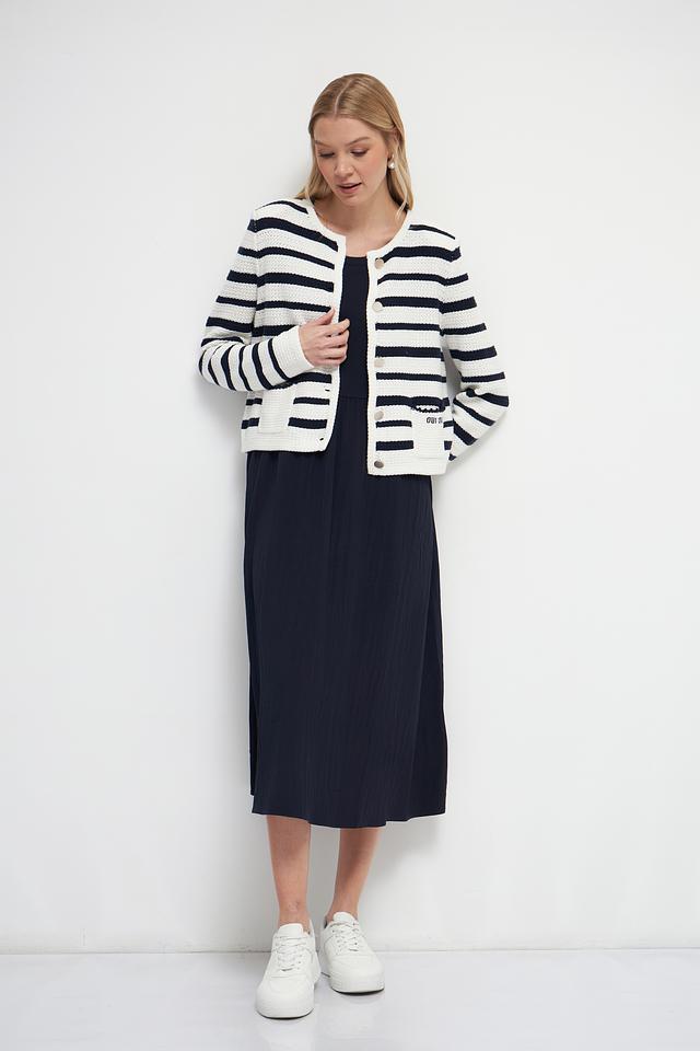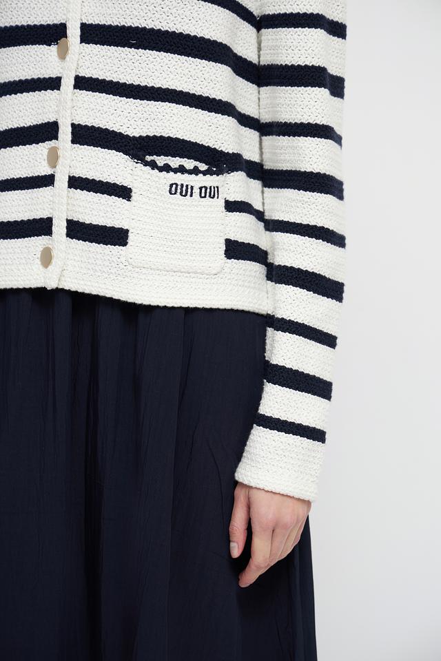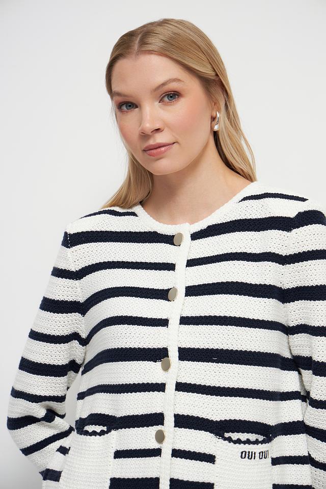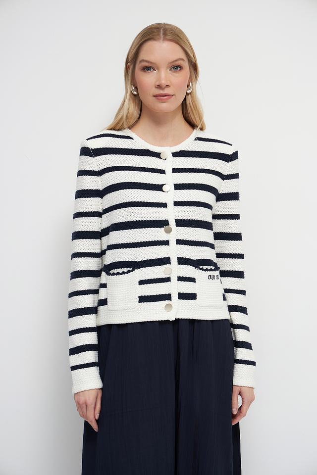 Этот жакет от Oui станет отличным дополнением к вашему гардеробу. Модель выполнена в полосатом дизайне, сочетающем белый и тёмно-синий цвета, что придает ей свежий и современный вид.