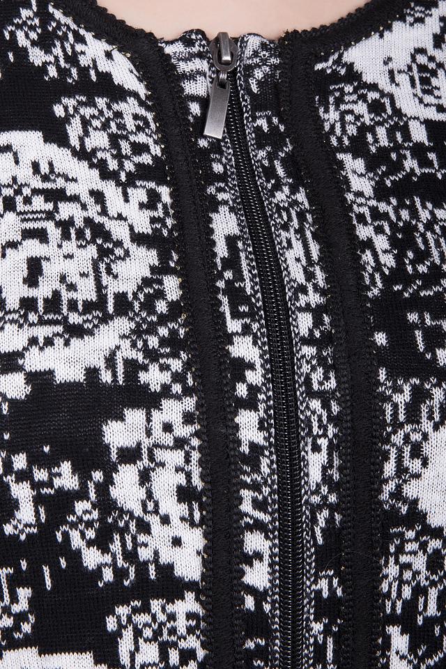 Основной цвет жакета – чёрный, но благодаря оригинальному белому цветочному принту он выглядит свежо и интересно. Застёжка на молнии позволяет легко надевать и снимать жакет, а также регулировать степень его прилегания.