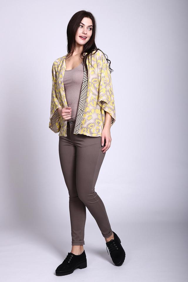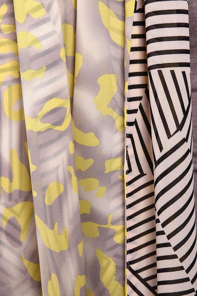 Особенностью модели является яркий принт, сочетающий в себе геометрические узоры в жёлтых, чёрных и бежевых тонах. Такой рисунок добавит оригинальности и индивидуальности вашему стилю.