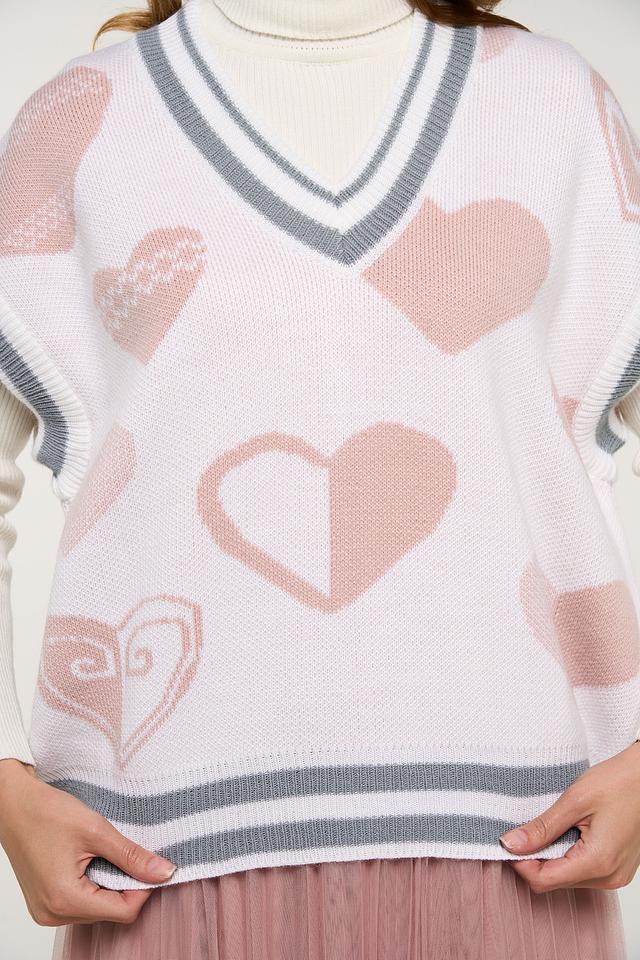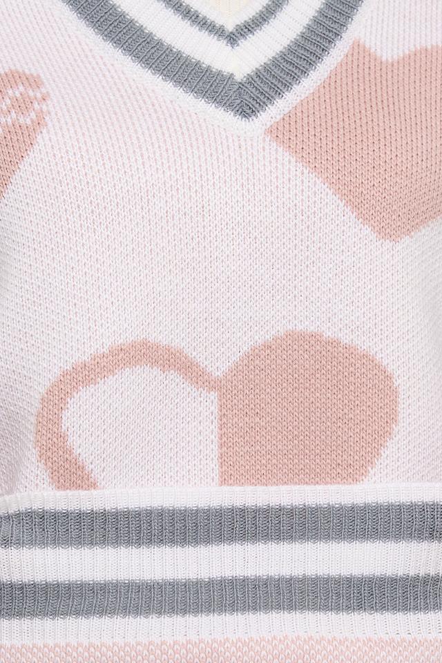 Этот стильный жилет от BE YOU станет прекрасным дополнением к вашему образу. Модель выполнена в белом цвете с милым принтом в виде розовых сердечек. Классический V-образный вырез и декоративная полоска добавляют изделию изысканности.