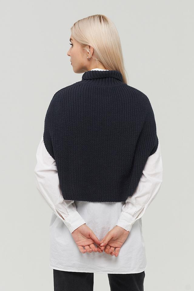 Жилет имеет укороченный крой и воротник-стойку, что придает ему современный и лаконичный вид. Фактурная вязка делает этот жилет особенно интересным и привлекательным.