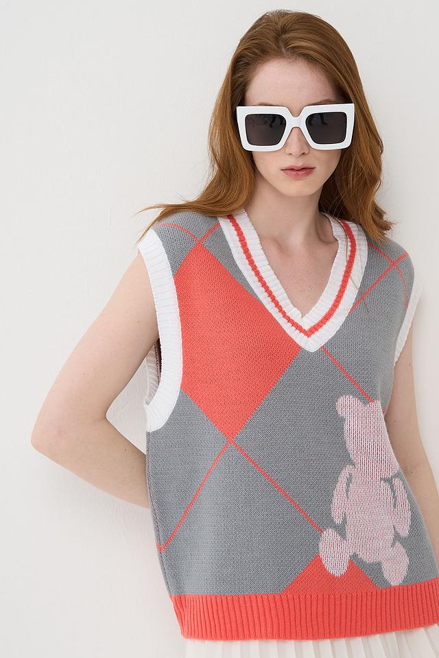 Жилет имеет V-образный вырез и свободный крой, что обеспечивает комфортную посадку по фигуре. Оригинальный принт в виде милого медвежонка добавляет образу игривости и индивидуальности.