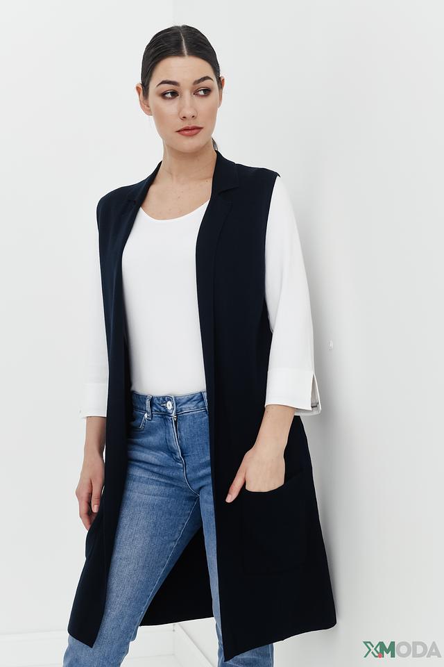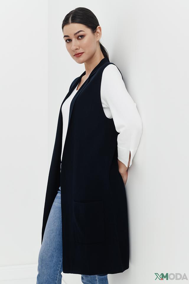 Жилет имеет классический отложной воротник и прорезные карманы. Он прекрасно сочетается с блузками, рубашками и топами, создавая стильные и элегантные образы.