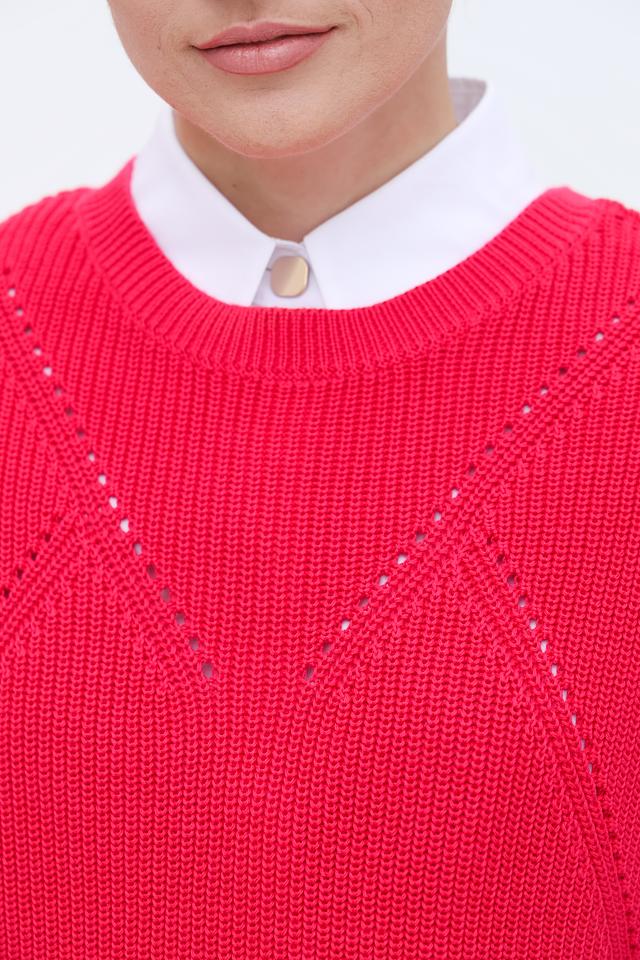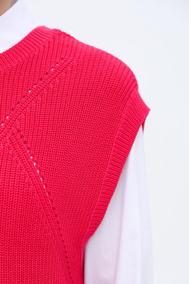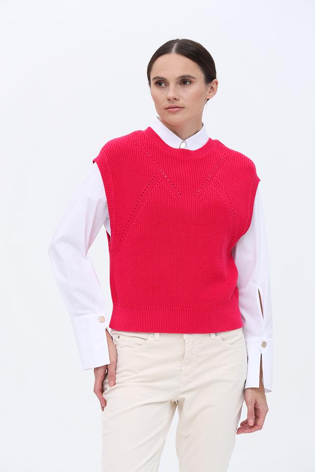 Малиновый вязаный жилет Taifun из 100% органического хлопка – стильное и комфортное решение для создания многослойных образов. Модель имеет V-образный вырез и фактурную вязку с косами. Состав: хлопок органич. 100%