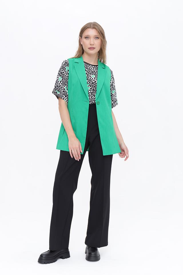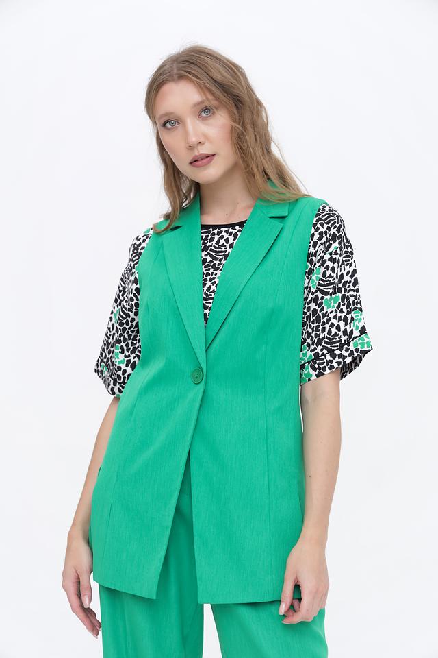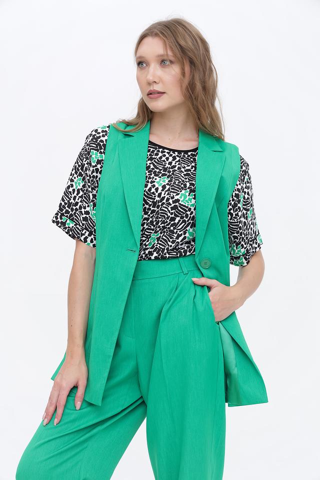 Классический крой с лацканами и застежкой на одну пуговицу придает жилету элегантный вид. Он идеально сочетается с брюками, юбками и платьями, создавая стильные и современные комплекты.
