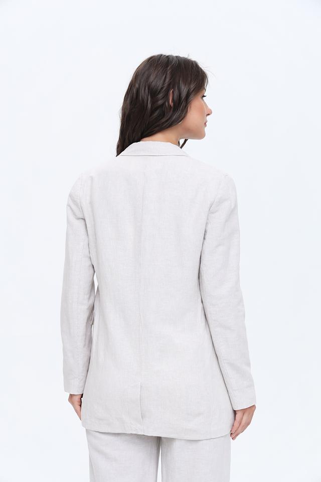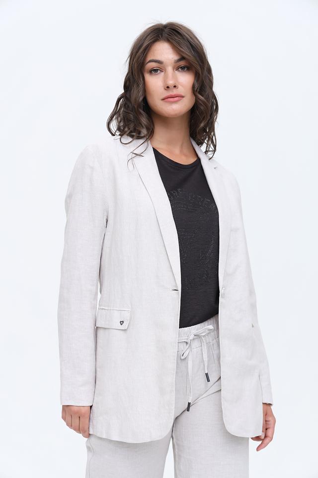 Этот жакет от Zhrill выполнен из высококачественного льняного полотна с добавлением хлопка, что обеспечивает комфорт и воздухопроницаемость в теплую погоду. Преобладающий цвет – бежевый, с легкой текстурой, характерной для натурального льна.
