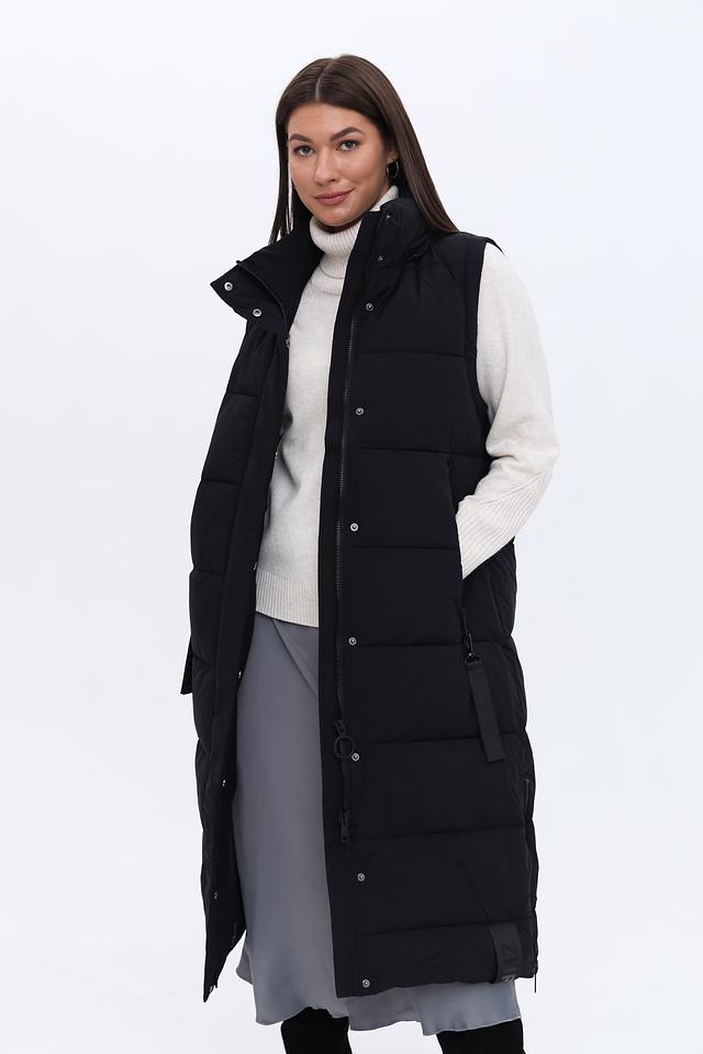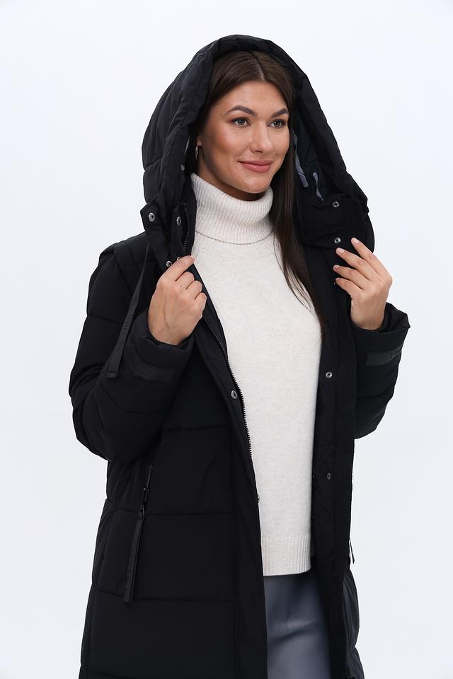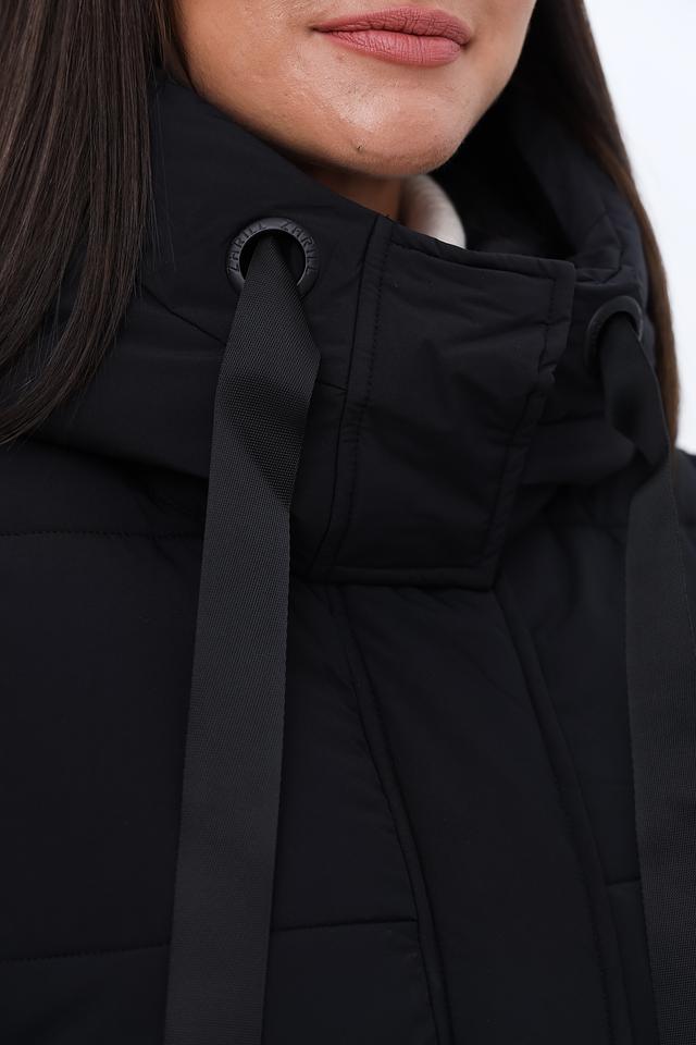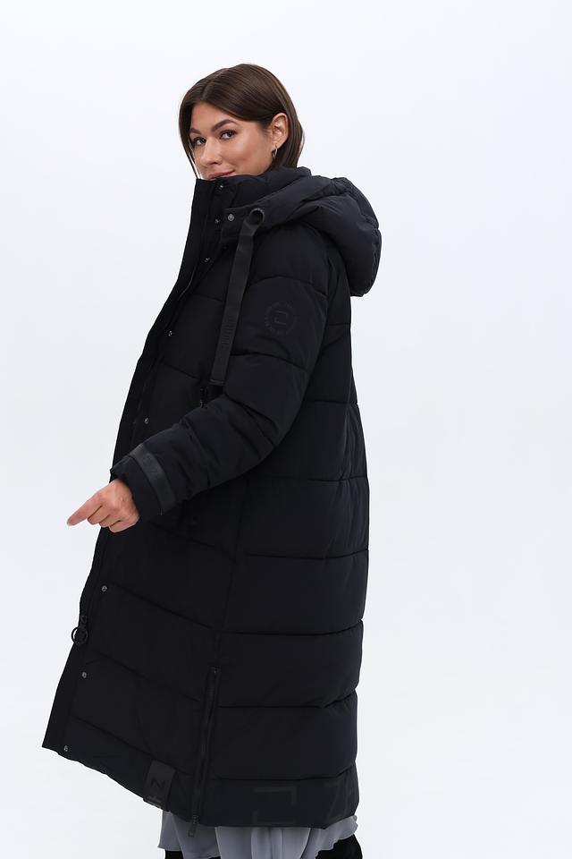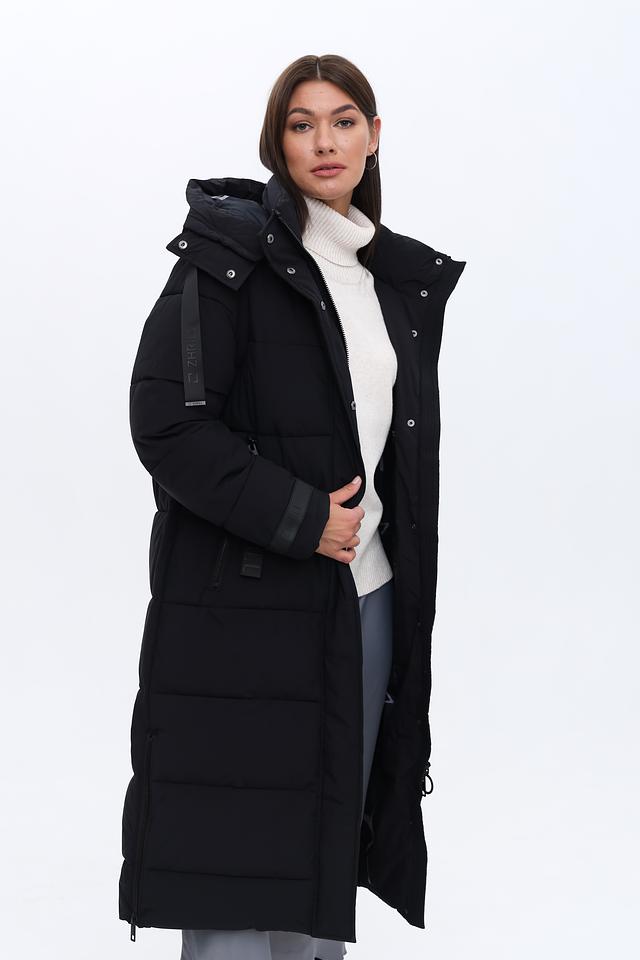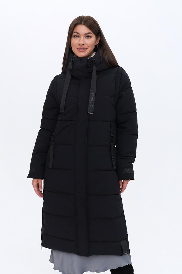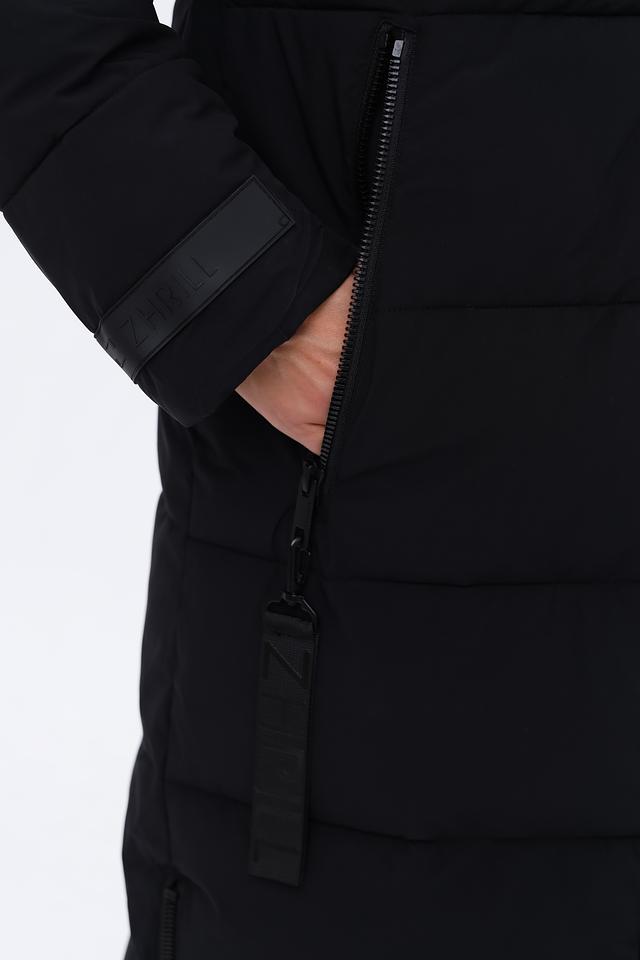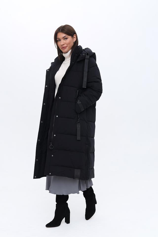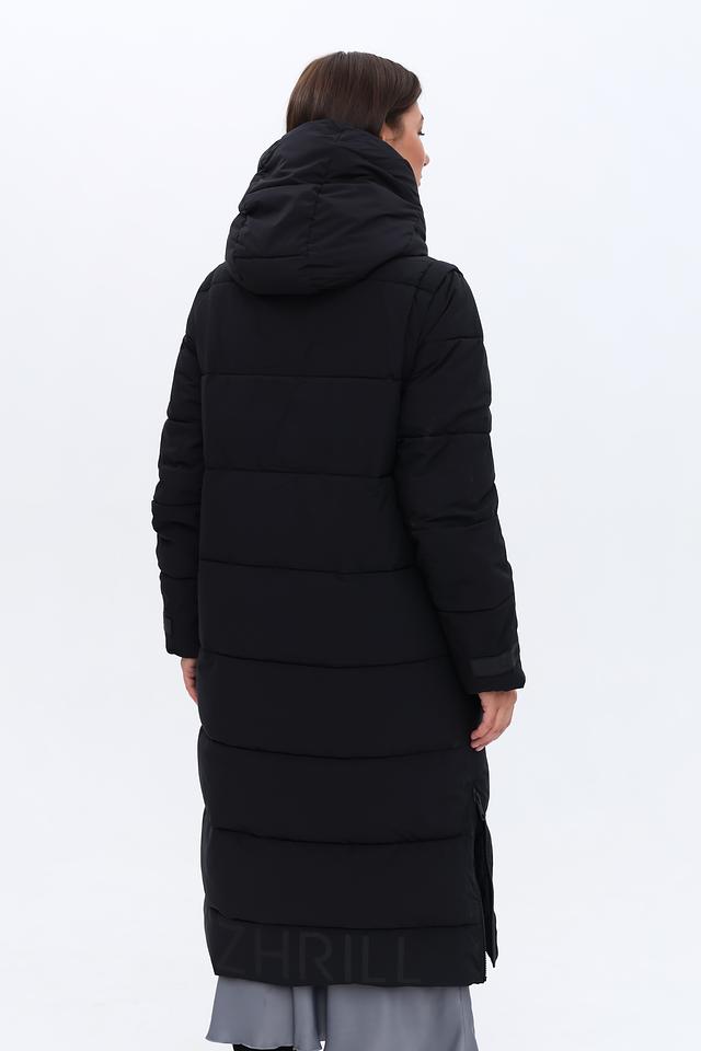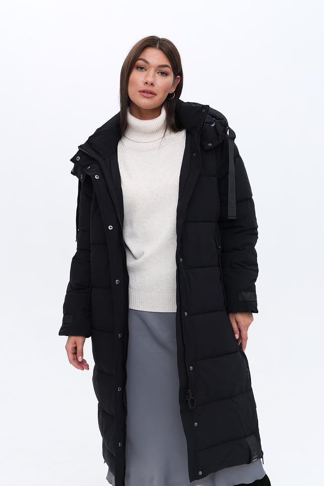 Это женское пальто от бренда Zhrill выполнено в классическом чёрном цвете и имеет длину до середины икры. Пальто имеет стеганую текстуру, которая придает ему современный вид и обеспечивает дополнительную теплоизоляцию.