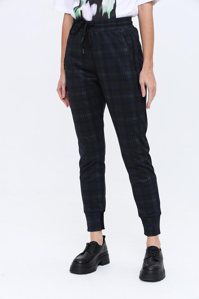 Женские брюки Zhrill в клетку тёмно-зелёного и чёрного цвета — удобная и стильная модель с эластичным поясом и манжетами. Идеальный выбор для создания повседневных образов. Состав: полиэстер 53%, вискоза 43%, эластан 4%