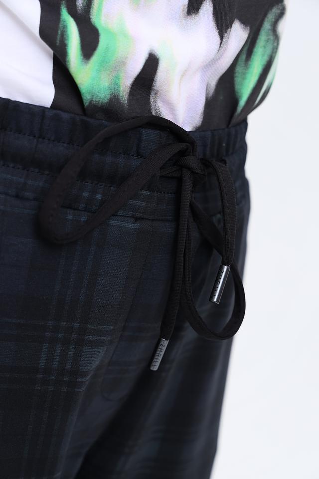 Брюки выполнены в тёмно-зелёном и чёрном цвете с клетчатым принтом, что придает им современный и стильный вид. Они изготовлены из смеси полиэстера, вискозы и эластана, что обеспечивает мягкость, приятные тактильные ощущения и хорошую посадку по фигуре.