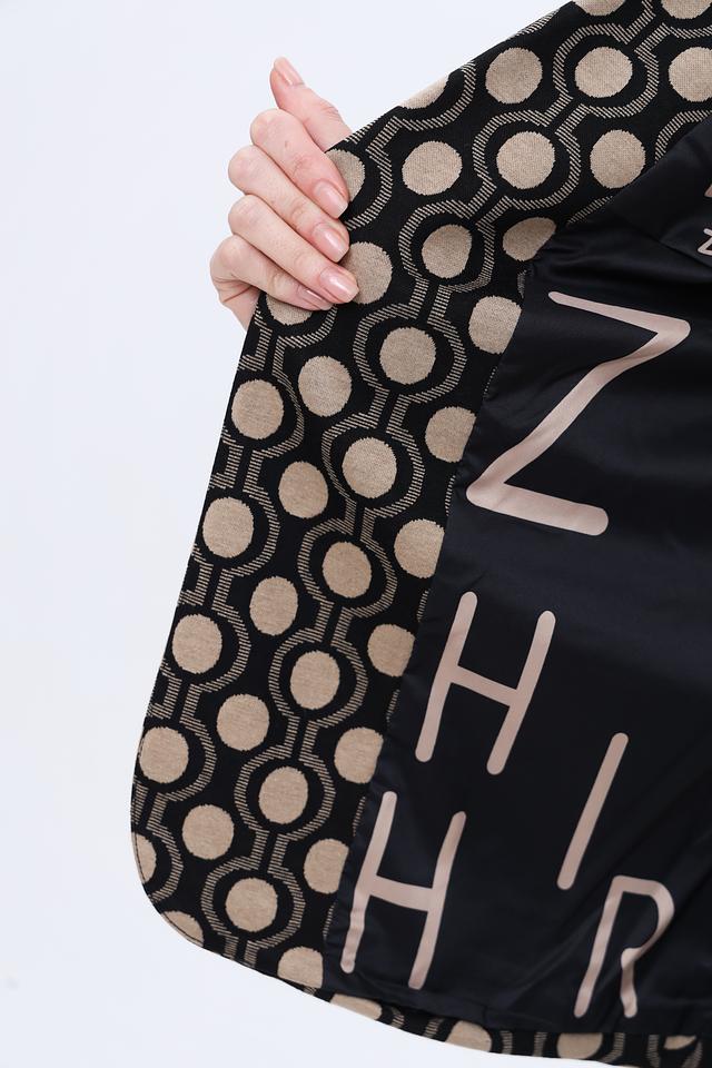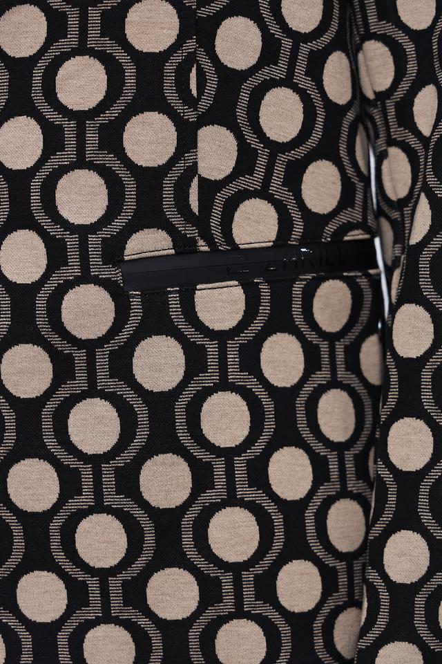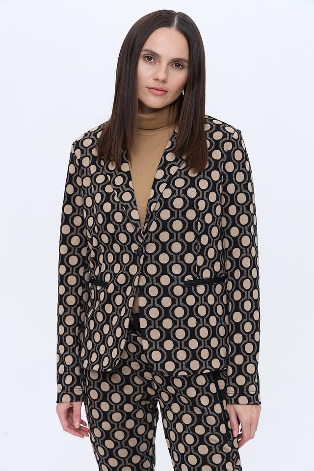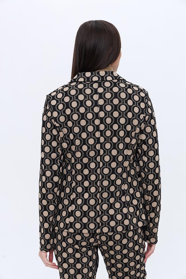 Этот жакет от Zhrill – идеальный выбор для создания современного и элегантного образа. Жакет выполнен в чёрном цвете и украшен выразительным геометрическим принтом, состоящим из кругов и цепочек бежевого оттенка.
