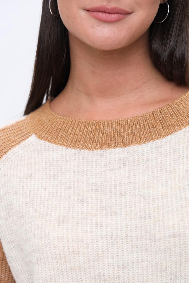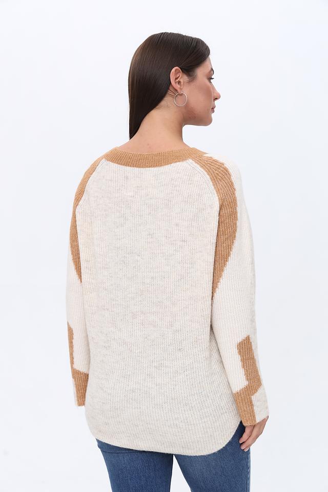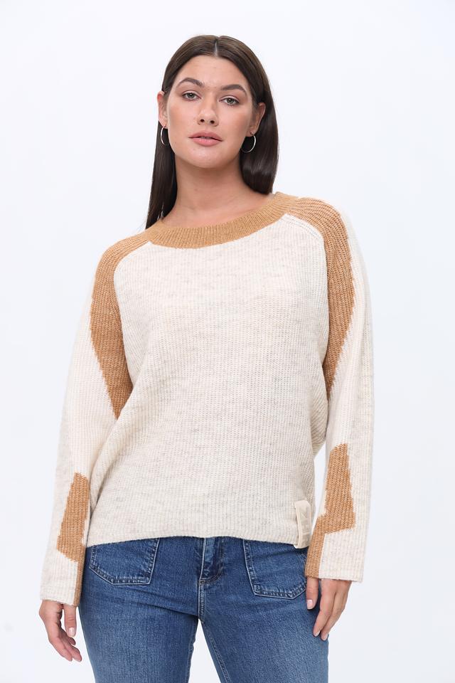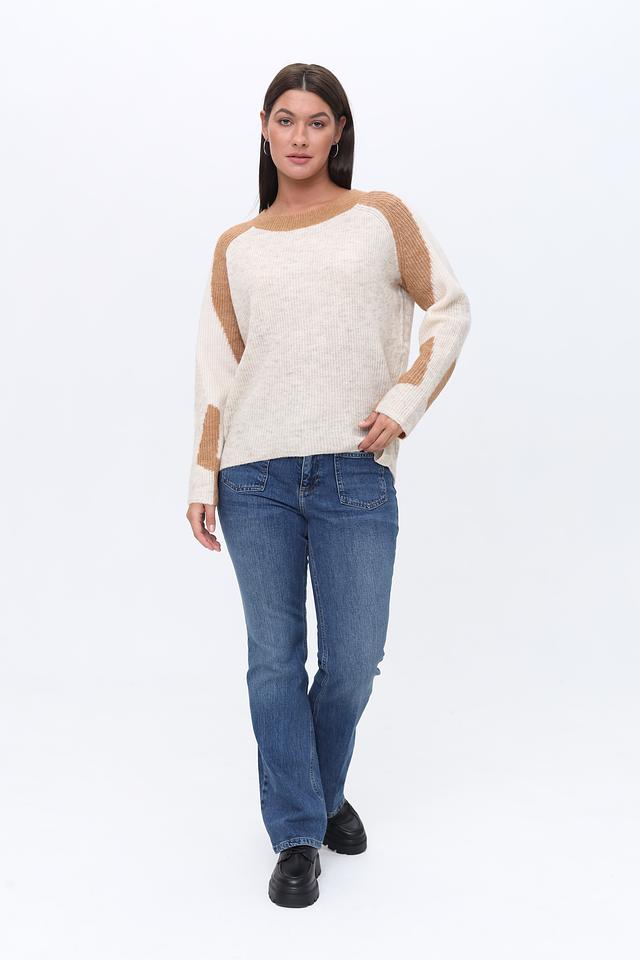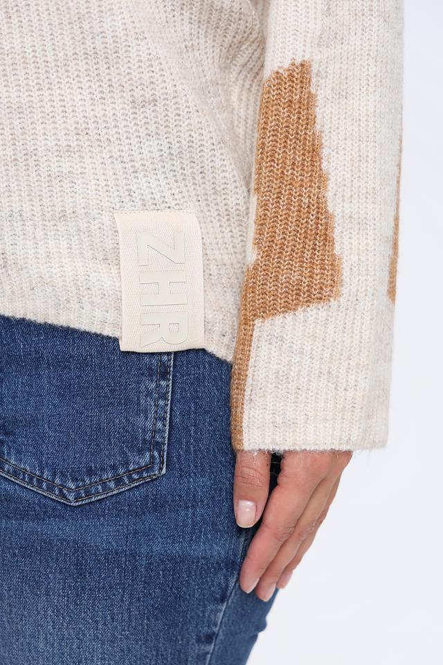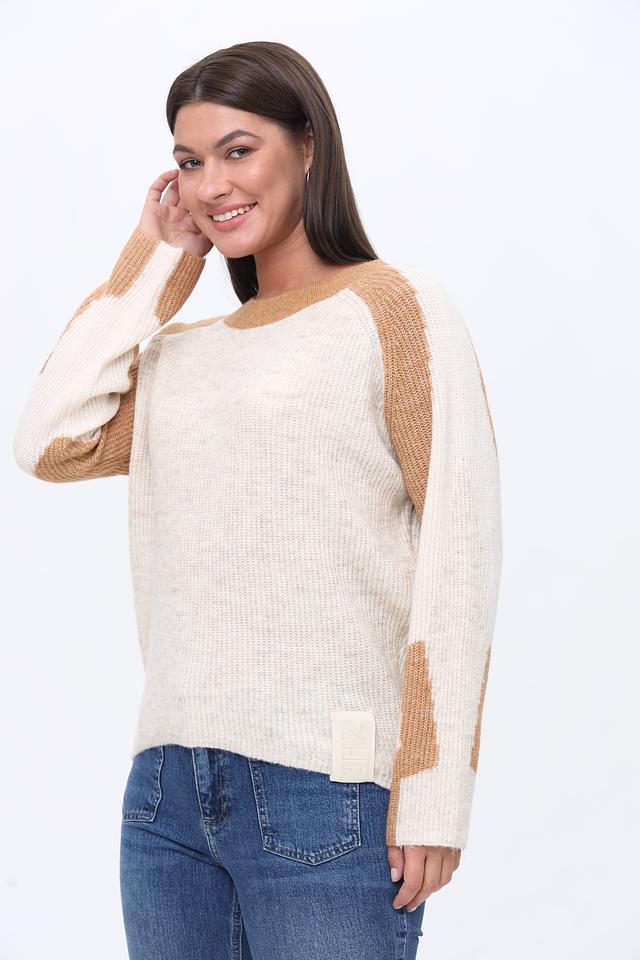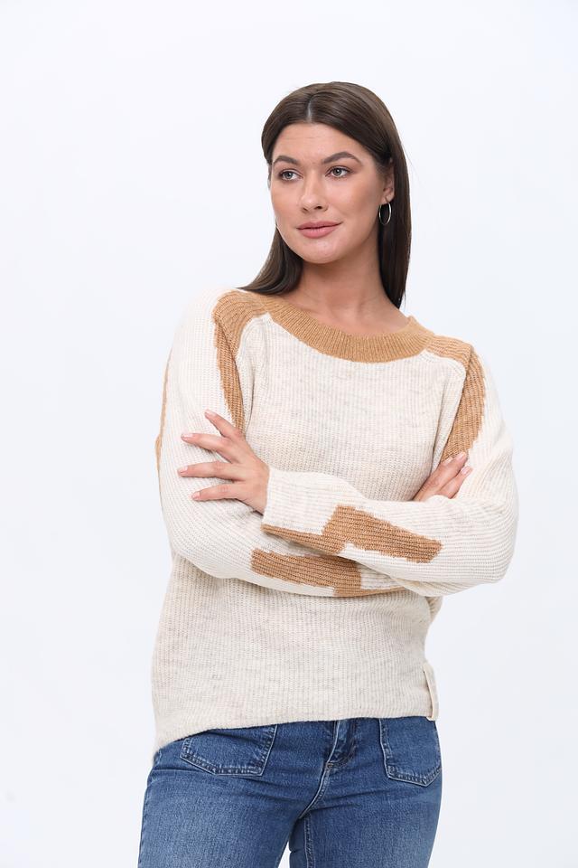 Этот пуловер от Zhrill выполнен в приятном бежевом цвете с акцентной коричневой отделкой на плечах и рукавах, что придает ему особый шарм и оригинальность.