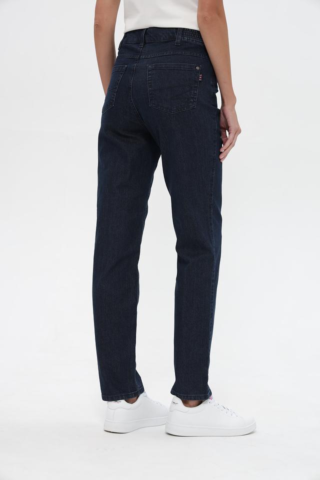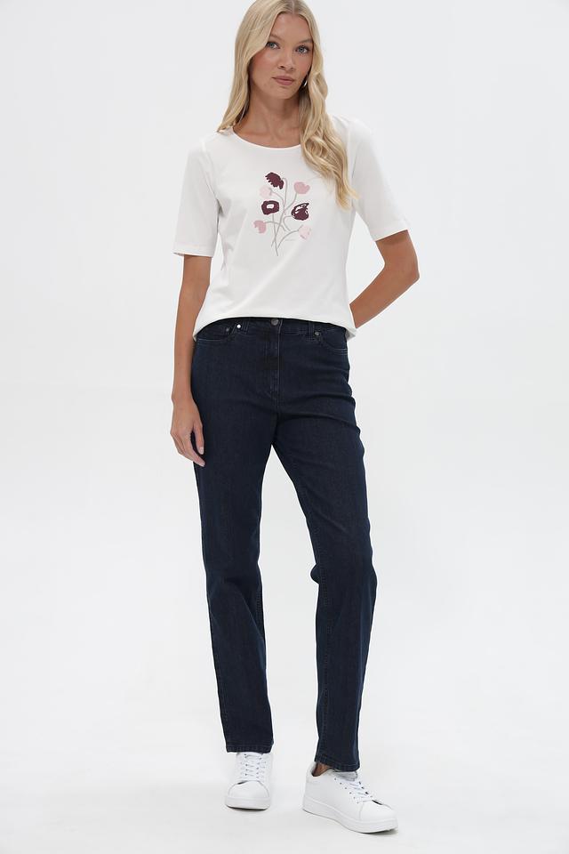 Джинсы имеют стандартную посадку, прямой крой, который визуально стройнит силуэт. Удобный эластичный пояс обеспечивает комфортную посадку по фигуре.
